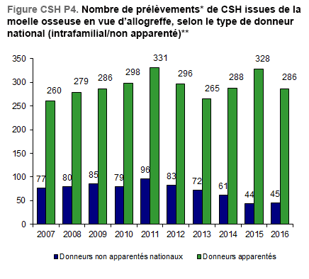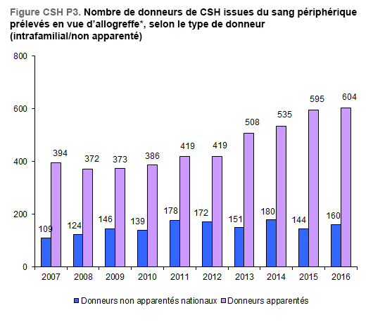 Figure CSH P3. Nombre de donneurs de CSH issues du sang périphérique prélevés en vue d’allogreffe*, selon le type de donneur (intrafamilial/non apparenté). (Voir aussi tableau CSH P2)