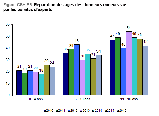 L’activité pédiatrique, malgré une variation entre 2012 et 2014, se maintient à un niveau stable sur 5 ans. Les variations ponctuelles peuvent s’expliquer par les protocoles thérapeutiques mis en place. Elle représente, en 2016, 5,2% de la totalité des prélèvements soient 282 cytaphérèses pour 174 mineurs de moins de 18 ans (1,6 cytaphérèses par patient). Elle a été réalisée dans 23 unités de cytaphérèse (Tableau CSH P1).