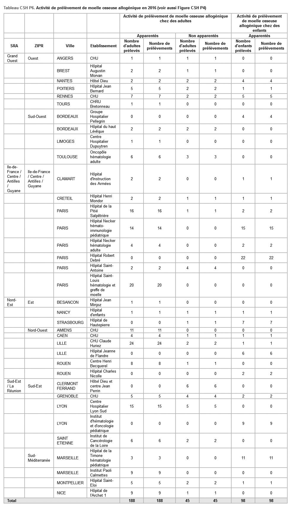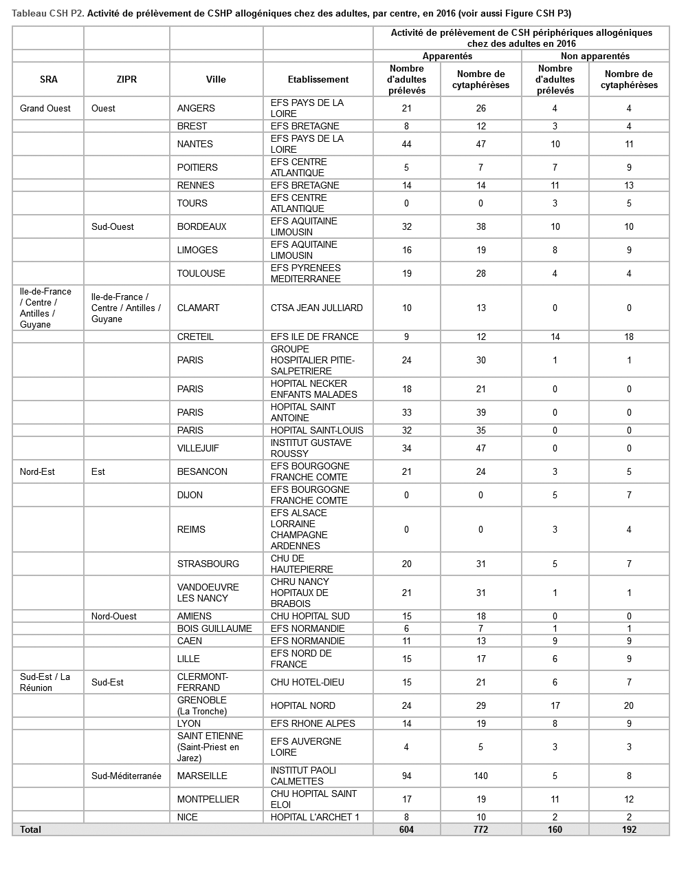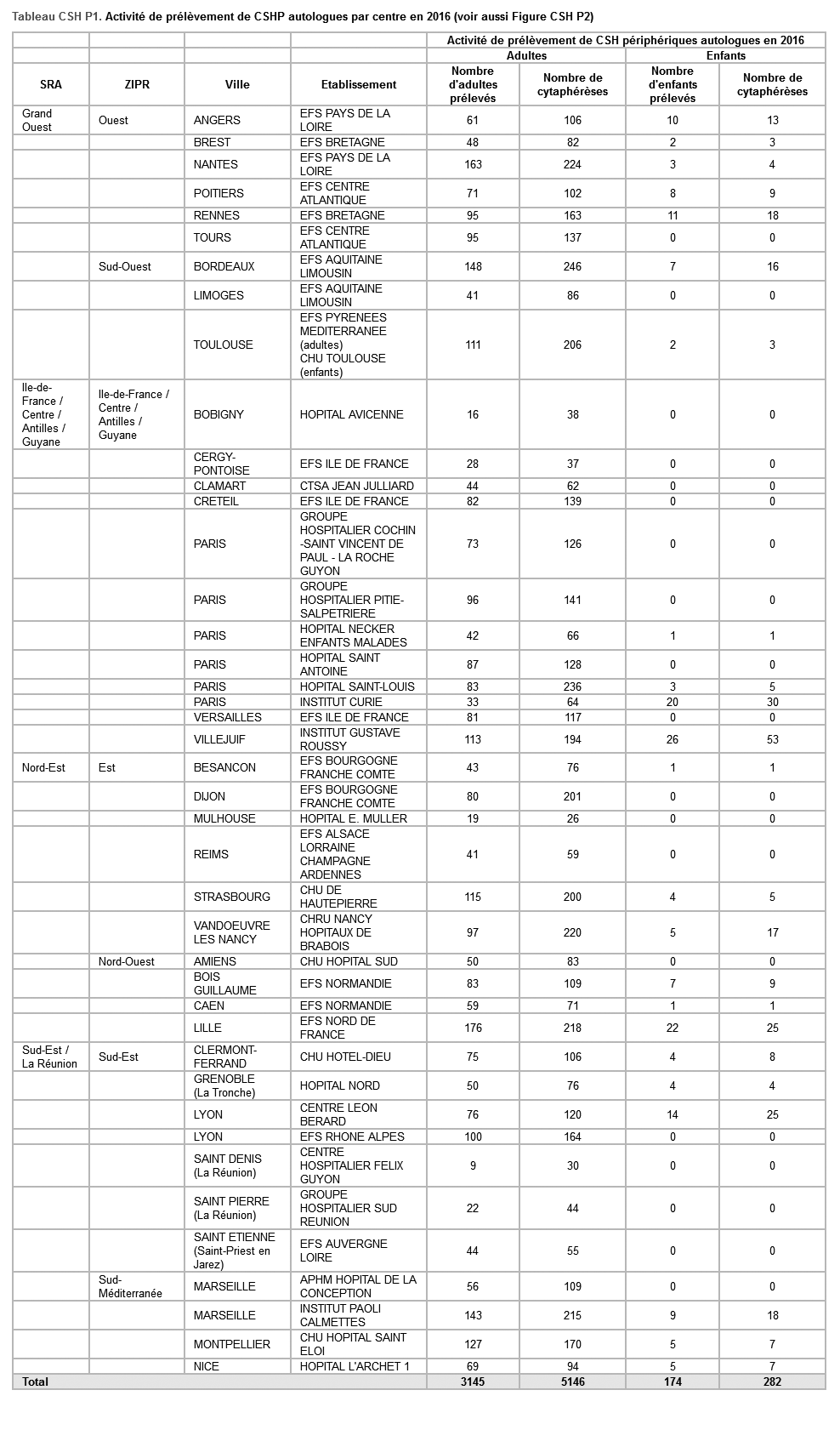 Tableau CSH P1. Activité de prélèvement de CSHP autologues par centre en 2016 (voir aussi Figure CSH P2)