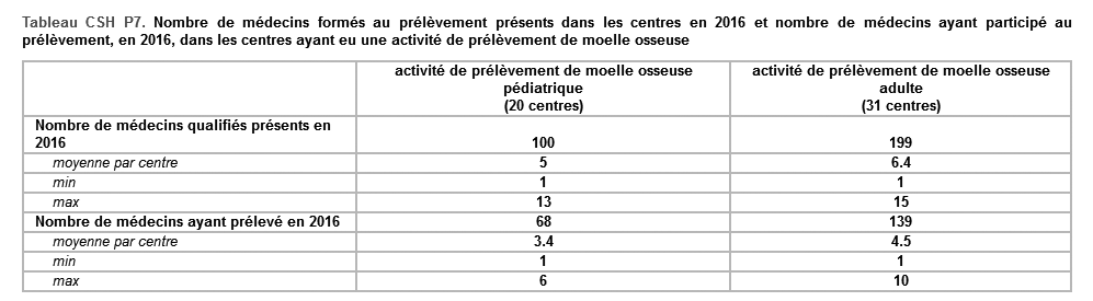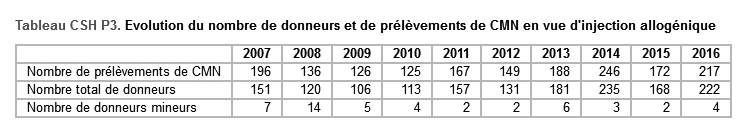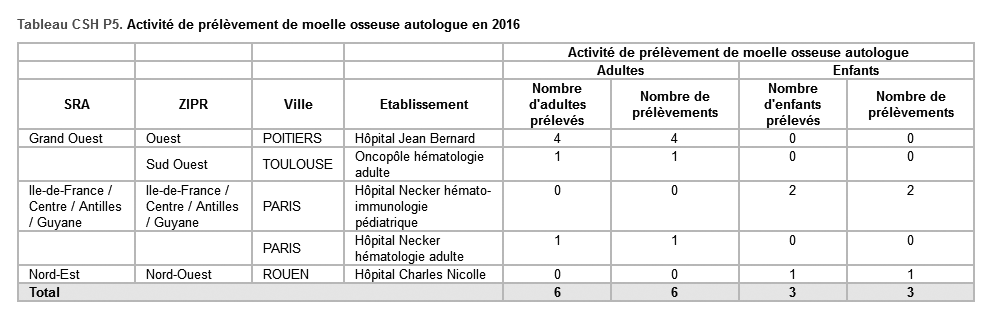 Concernant les prélèvements autologues de CSH réalisés en 2016, aucune comparaison n’a été réalisée avec le nombre de greffes autologues réalisées la même année, car les prélèvements autologues peuvent parfois être congelés plusieurs mois voire années avant d’être infusés.