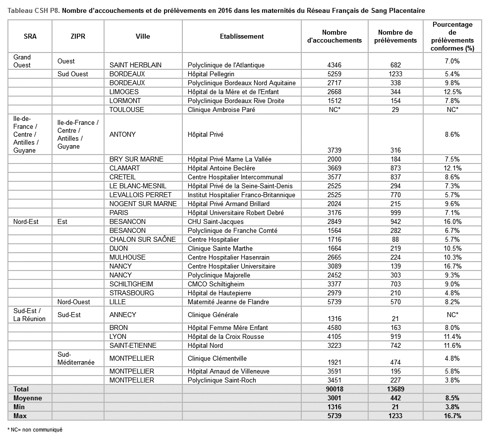 Le nombre de prélèvements de sang placentaire non apparentés déclaré par les maternités entre le 1er janvier et le 31 décembre 2016 a été comparé au nombre de prélèvements déclarés par les banques de sang placentaire au Réseau Français de Sang Placentaire pour la même période.