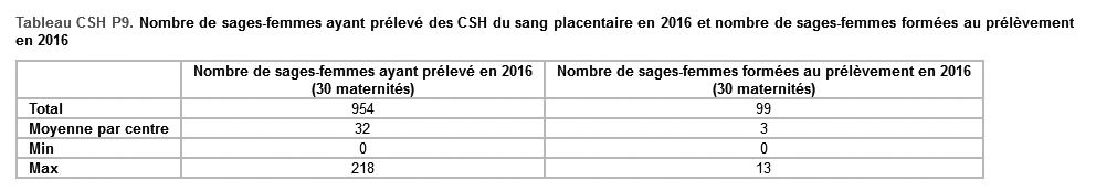 Tableau CSH P9. Nombre de sages-femmes ayant prélevé des CSH du sang placentaire en 2016 et nombre de sages-femmes formées au prélèvement en 2016