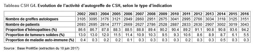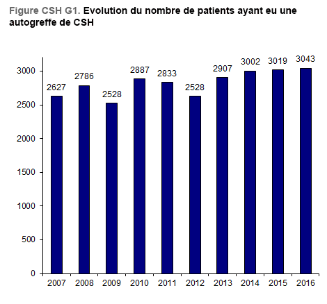En 2016, tous les centres répertoriés par l’Agence de la biomédecine ont déclaré leur activité d’autogreffe : 3 151 greffes autologues ont été réalisées pour 3 043 patients qui ont reçu une ou plusieurs autogreffes. Les chiffres des 10 dernières années montrent une augmentation modérée de 16% de l’activité d’autogreffe (Figure CSH G1).