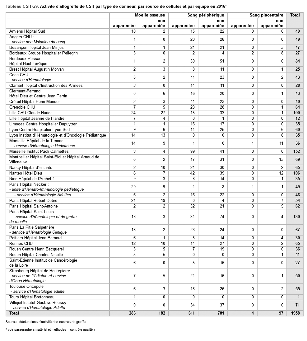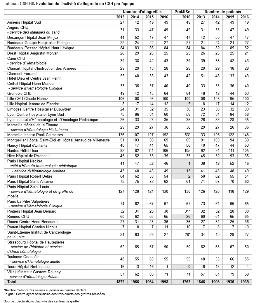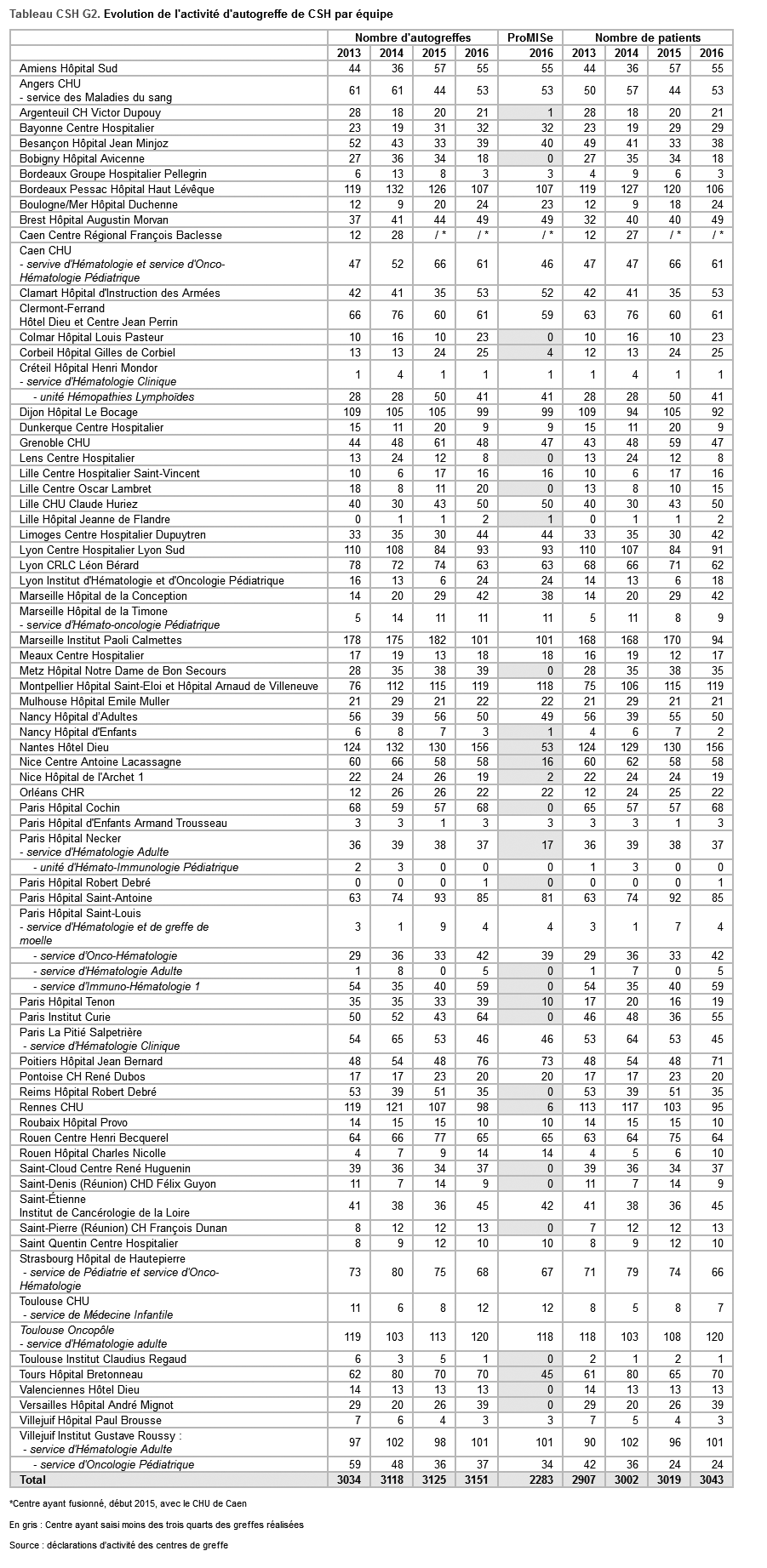 En 2016, 77 centres français ont réalisé des greffes de cellules souches hématopoïétiques (CSH). Cette activité est divisée en deux catégories : greffes allogéniques et greffes autologues. Parmi ces 77 centres, 40 n’ont réalisé que des autogreffes, 1 n’a réalisé que des allogreffes et 36 ont eu une activité mixte.