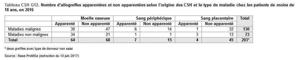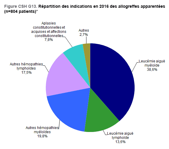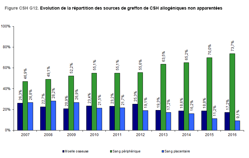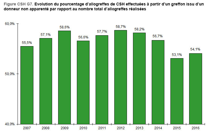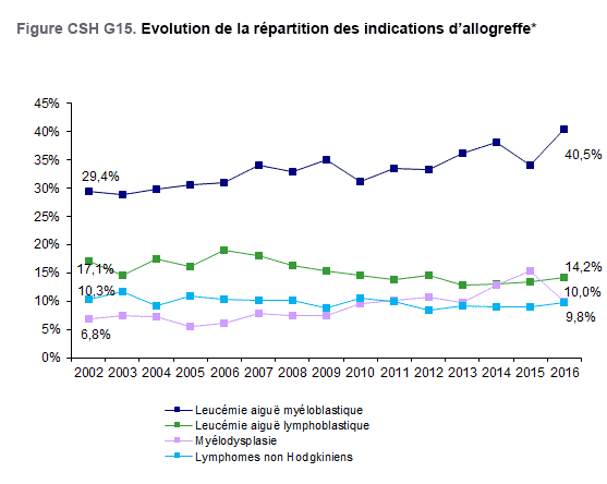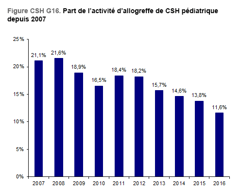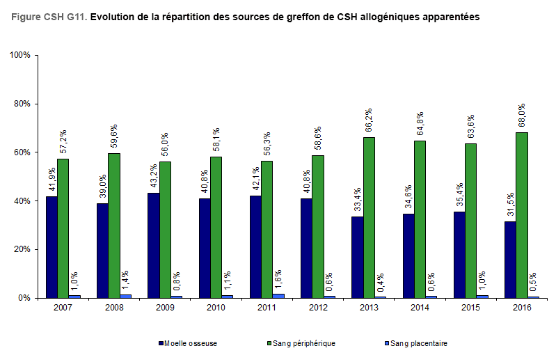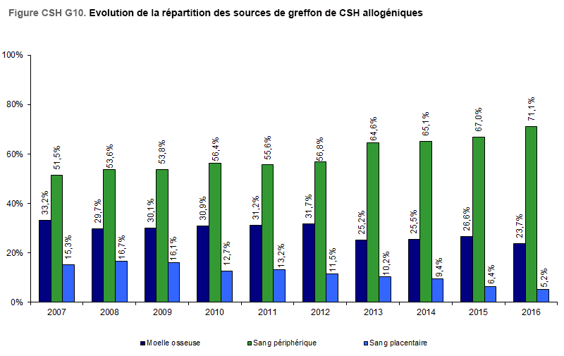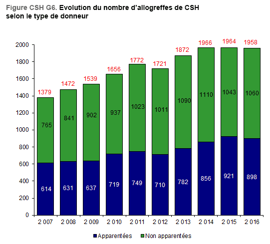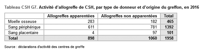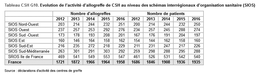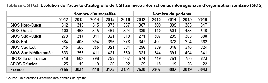 En 2016, 77 centres français ont réalisé des greffes de cellules souches hématopoïétiques (CSH). Cette activité est divisée en deux catégories : greffes allogéniques et greffes autologues. Parmi ces 77 centres, 40 n’ont réalisé que des autogreffes, 1 n’a réalisé que des allogreffes et 36 ont eu une activité mixte.