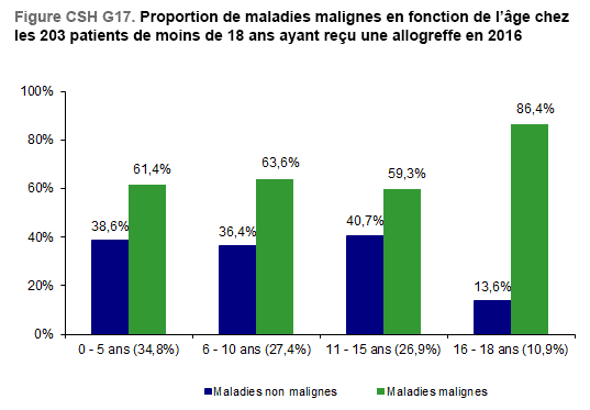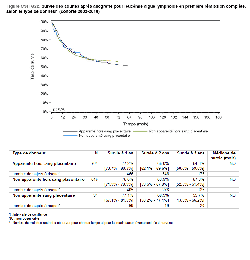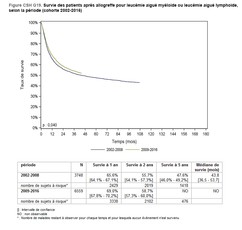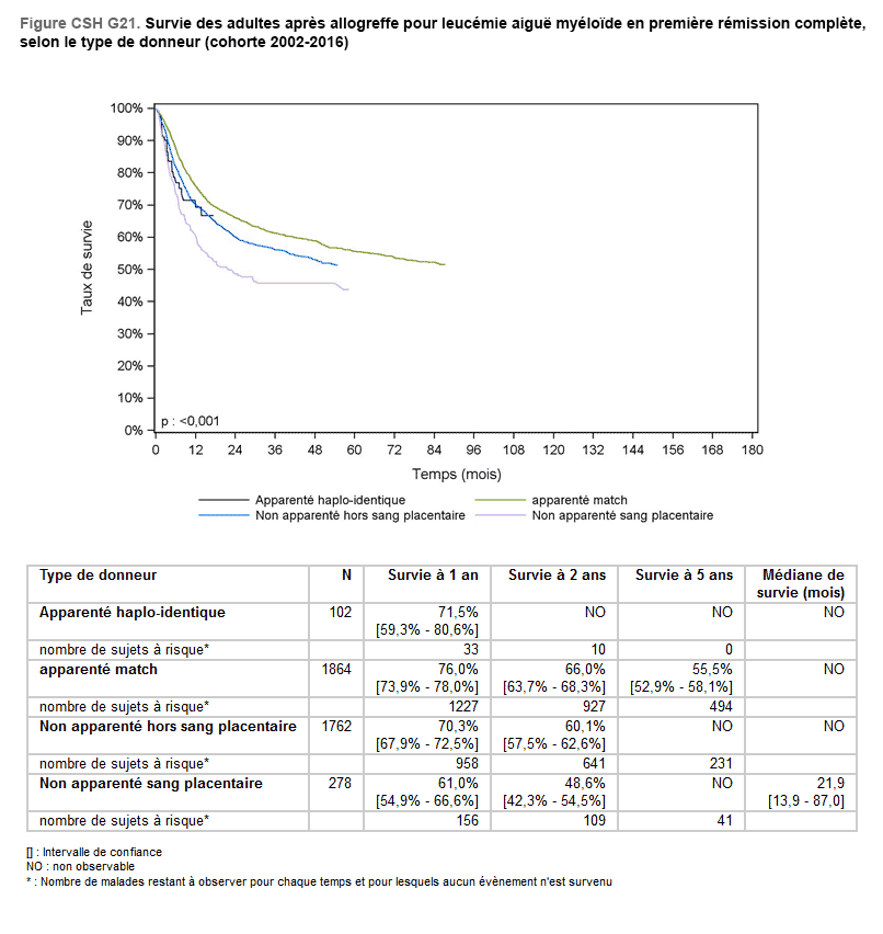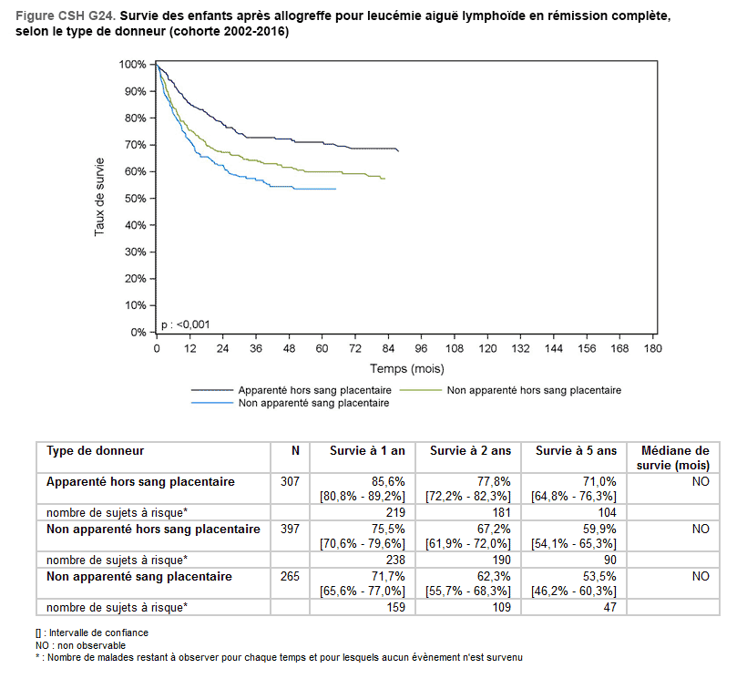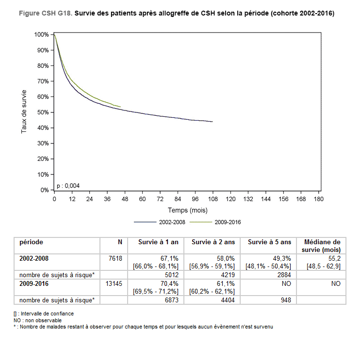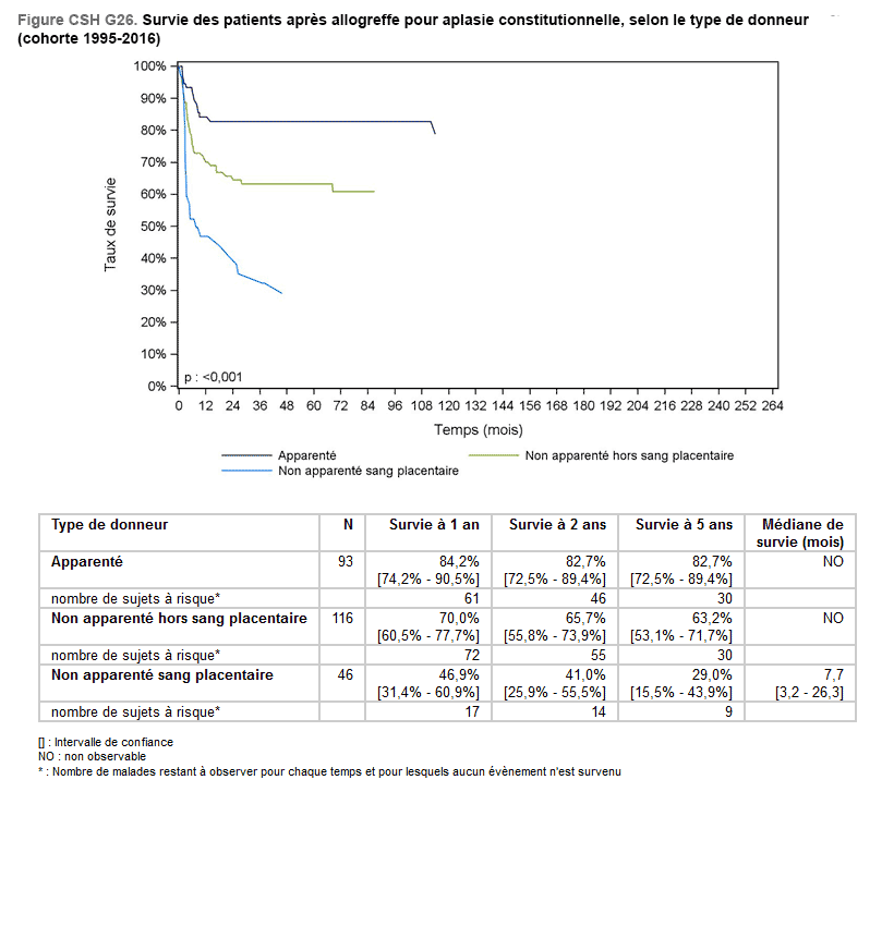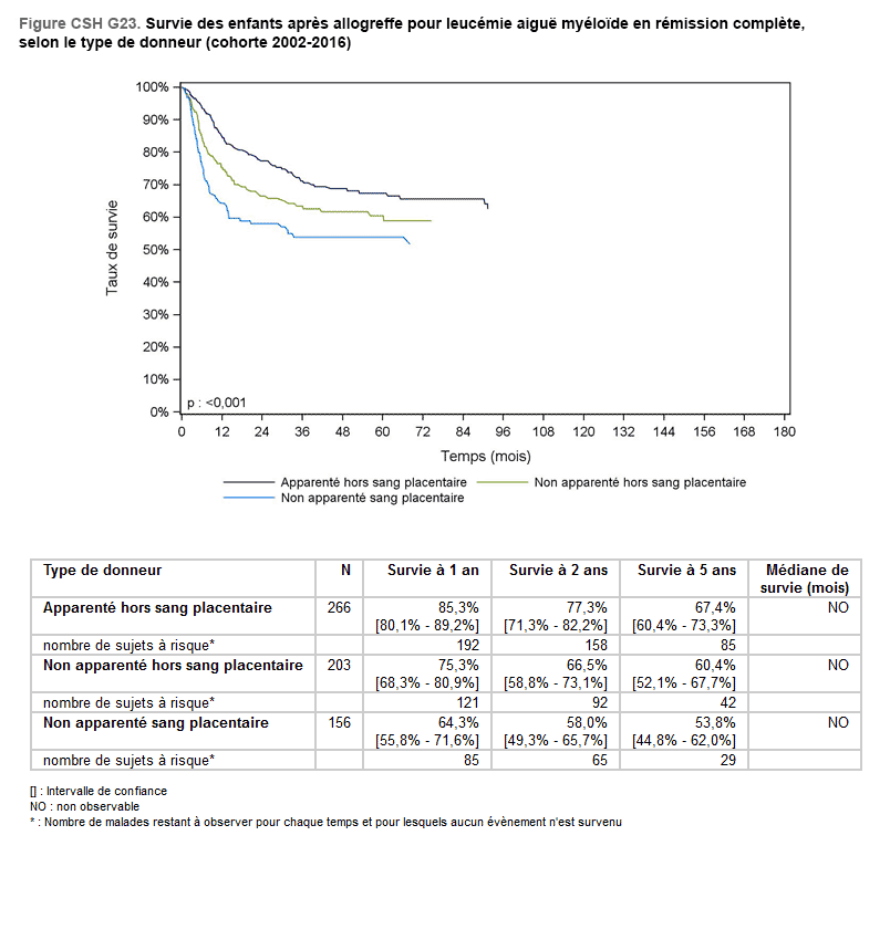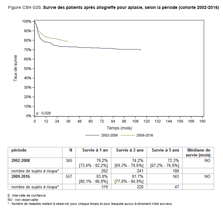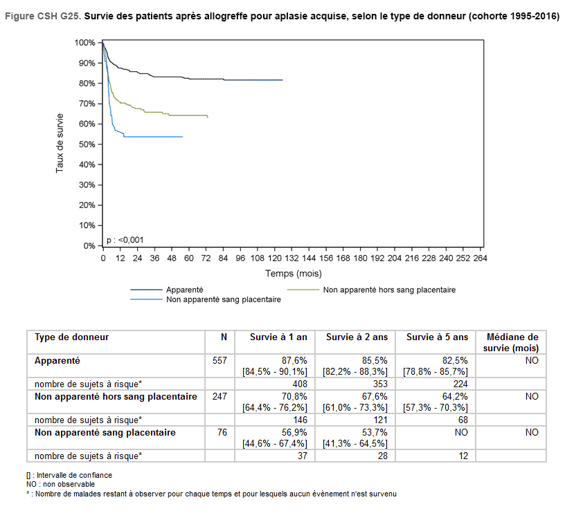 Les figures suivantes (Figure CSH G25, Figure CSH G26) ont été réalisées à partir d’une cohorte large (1995-2016) et sans distinguer enfants et adultes, en raison du faible effectif des patients allogreffés pour aplasie.