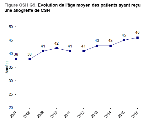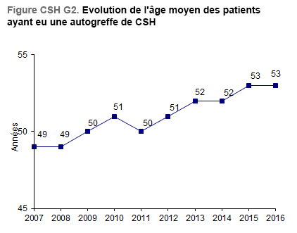L’âge moyen des patients recevant une greffe de CSH autologue est de 53 ans. L’âge médian de ces patients est de 58 ans et 19% d’entre eux ont plus de 65 ans (Figure CSH G2).