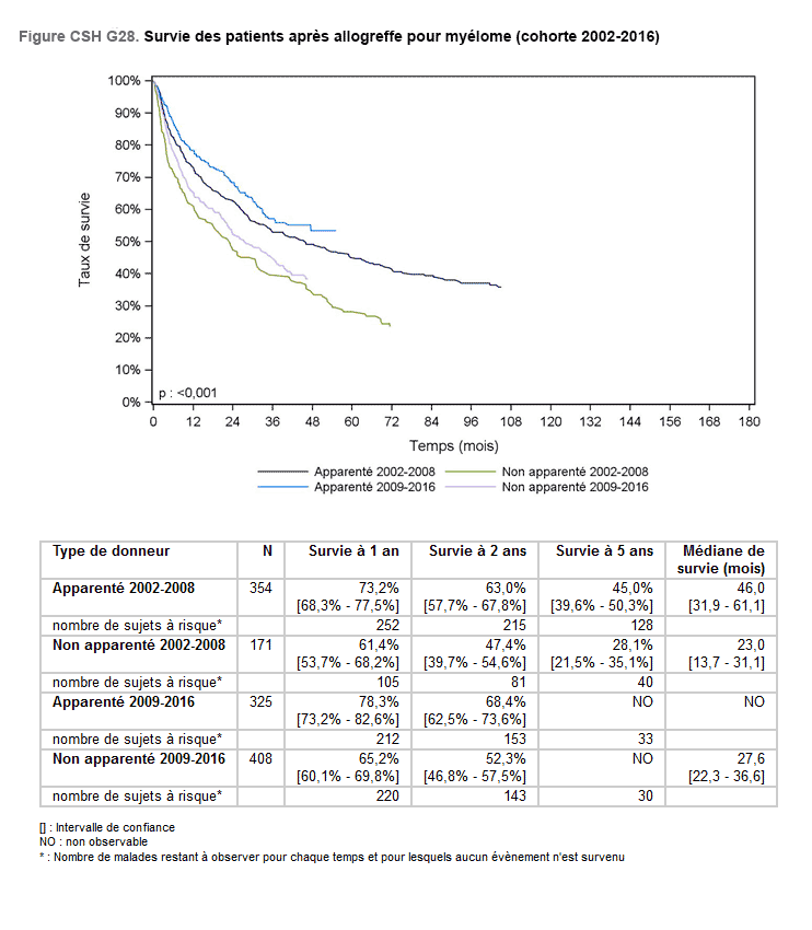 Figure CSH G28. Survie des patients après allogreffe pour myélome (cohorte 2002-2016)