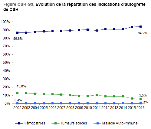 En 2016, le nombre de patients ayant bénéficié d’une autogreffe est de 3 043. Parmi eux, 2 194 patients ont eu leurs données saisies dans la base européenne ProMISe (72%), ce qui permet de répartir les indications d’autogreffe comme suit : 2 066 patients ont été traités pour hémopathies essentiellement malignes (94,2%), 120 (soit 5,5%) pour une tumeur solide et 8 patients (0,3%) ont été traités pour une maladie auto-immune (Tableau CSH G4, Figure CSH G3, Figure CSH G4, Figure CSH G5). Néanmoins, les données de 849 patients n’ayant pas été saisies, cette répartition des indications est à interpréter avec réserve.