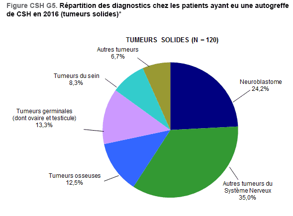 Les lymphomes et les myélomes représentent respectivement 41,9% et 53,3% des indications d’autogreffe pour hémopathie, et sont donc les indications majeures d’autogreffe (Figure CSH G4). Les autogreffes pour tumeur solide sont majoritairement réalisées dans le cadre de neuroblastomes, d’autres tumeurs du système nerveux ou de tumeurs germinales (Figure CSH G5). Les autres indications minoritaires sont multiples et controversées (Figure CSH G3, Figure CSH G4, Figure CSH G5).