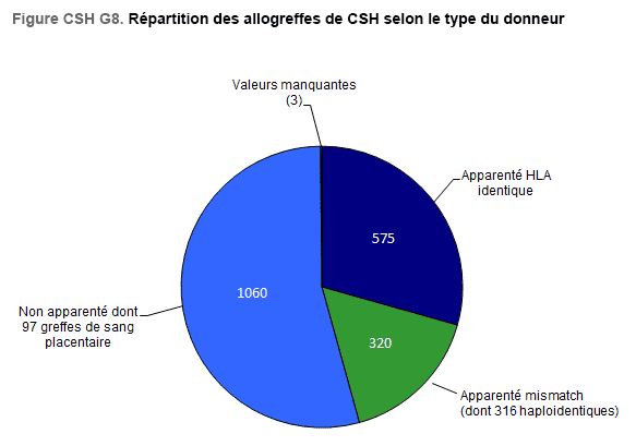 Le nombre total de greffes réalisées et le nombre total de patients greffés sont obtenus d’une part par les fiches papier d’activité recueillies auprès de chaque centre, et d’autre part par extraction de la base ProMISe (base de données de l’EBMT, gérée à Londres). Lors du contrôle qualité effectué par l’Agence de la biomédecine, ces deux sources de données sont comparées et en cas de discordance, des demandes de correction sont envoyées aux centres de greffe. Par ailleurs le nombre de greffes allogéniques non apparentées (Tableau CSH G7, Tableau CSH G9, figure CSH G6) est comparé pour chaque centre au nombre de prélèvements de greffons de CSH réalisés pour des patients français et recensés par le Registre France Greffe de Moelle (Tableau RFGM 8). Les discordances qui persistent après contrôle auprès des centres sont dues essentiellement au fait que certains greffons ne sont pas infusés (état du patient), ou que certains greffons prélevés en fin d’année sont infusés au début de l’année suivante, ou encore au fait que des fractions de greffons prélevés les années antérieures ont été congelées puis infusées plus tardivement aux patients.