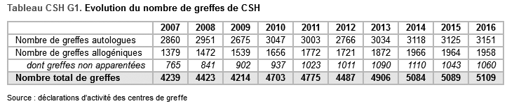 Tableau CSH G1. Evolution du nombre de greffes de CSH
