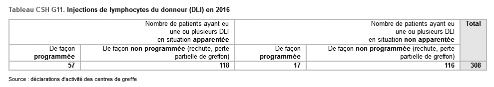 - des informations quantitatives relatives aux greffes : le nombre total de greffes réalisées et le nombre total de patients greffés, par centre et par type de greffe (ces chiffres sont reportés dans les Tableaux CSH G2, CSH G8, CSH G9)