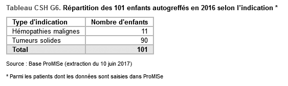 Le tableau CSH G2 rapporte l’activité d’autogreffe telle qu’elle a été déclarée par chaque centre. Dans la colonne centrale est notée l’activité extraite de la base de données ProMISe. En grisé sont indiqués les centres qui ont saisi dans ProMISe moins des trois quarts des greffes réalisées, soit 37% de la totalité des centres.