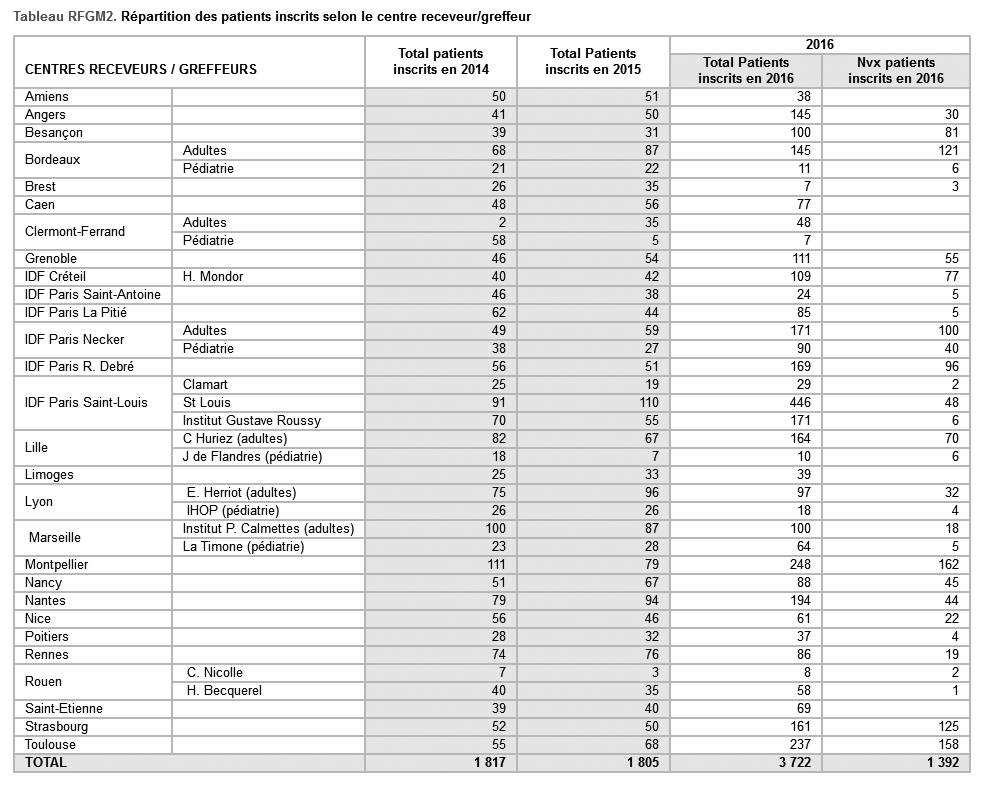 Tableau G17. Rein - Pourcentage de données manquantes du bilan médical à l’inscription pour les malades inscrits en 2016 et du bilan médical à la greffe pour les malades greffés en 2016