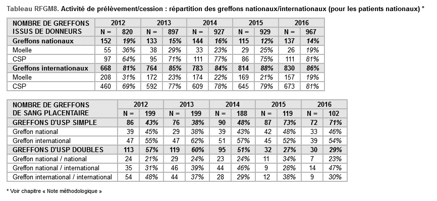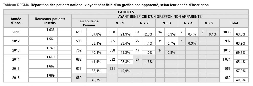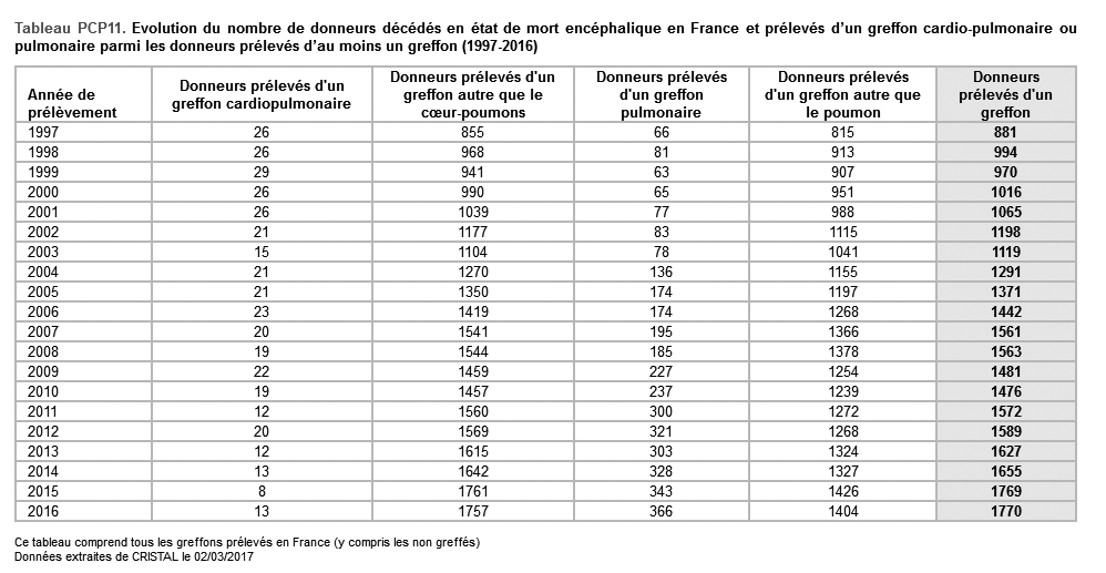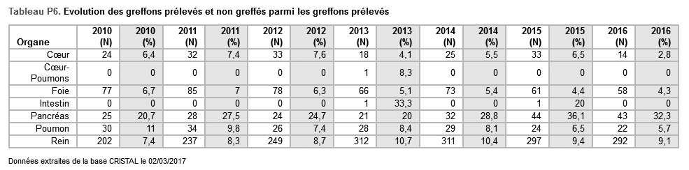 Tableau P6. Evolution des greffons prélevés et non greffés parmi les greffons prélevés