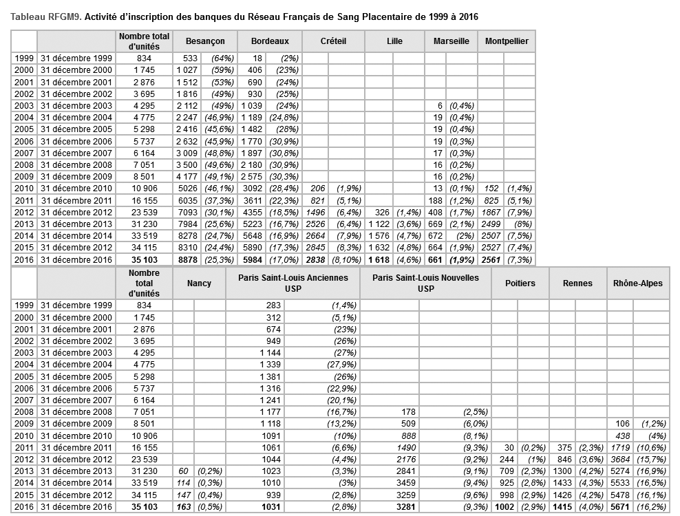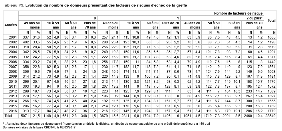Tableau P9. Evolution du nombre de donneurs présentant des facteurs de risques d'échec de la greffe