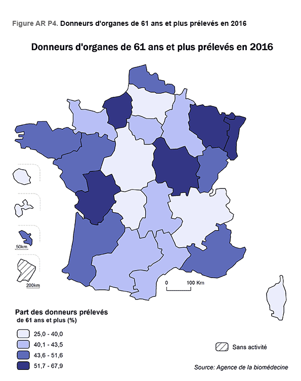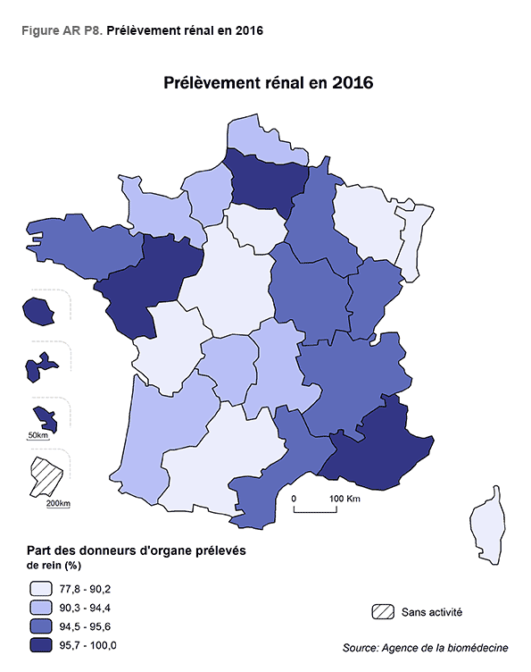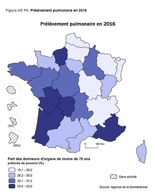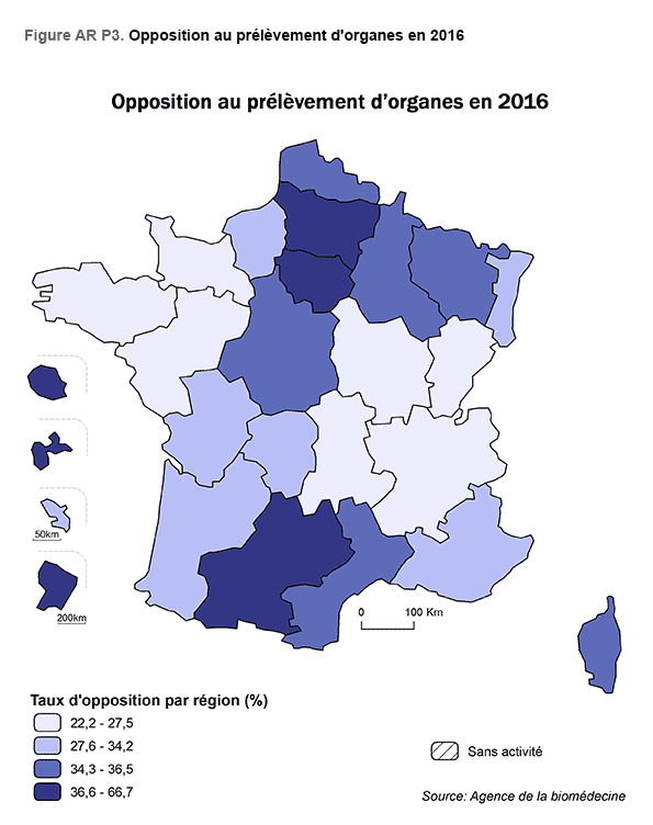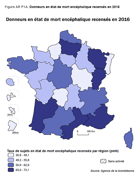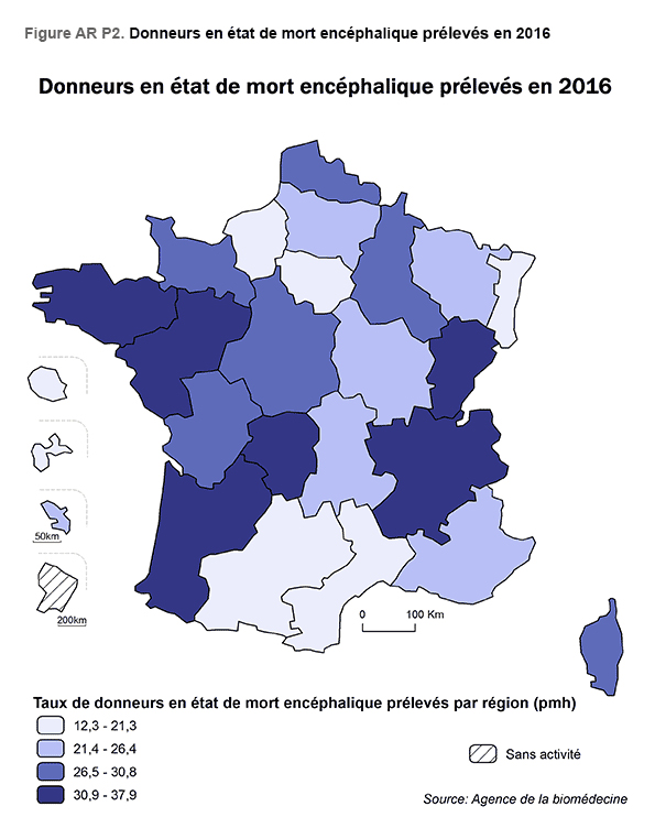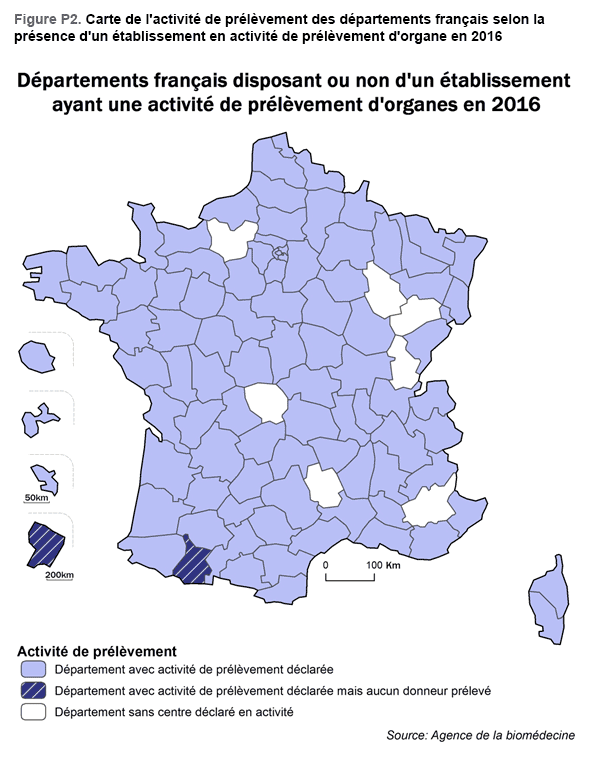 Figure P2. Carte de l'activité de prélèvement des départements français selon la présence d'un établissement en activité de prélèvement d'organe en 2016