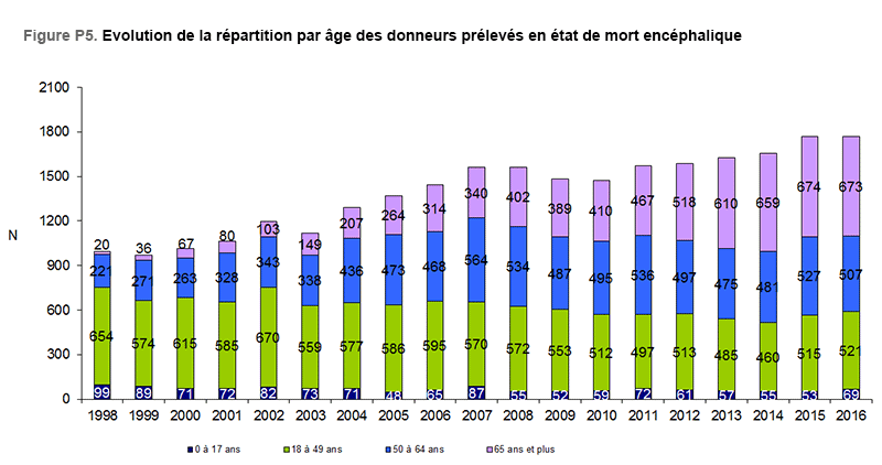 Figure P5. Evolution de la répartition par âge des donneurs prélevés en état de mort encéphalique