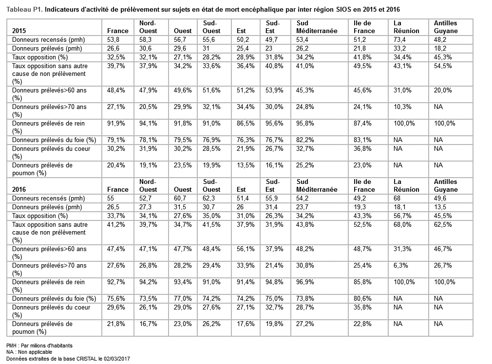 Tableau P1. Indicateurs d'activité de prélèvement sur sujets en état de mort encéphalique par inter région SIOS en 2015 et 2016