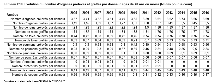 Tableau P10. Evolution du nombre d'organes prélevés et greffés par donneur âgés de 70 ans ou moins (60 ans pour le cœur)