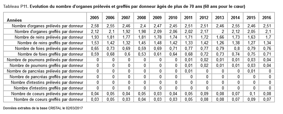 Tableau P11. Evolution du nombre d'organes prélevés et greffés par donneur âgés de plus de 70 ans (60 ans pour le cœur)
