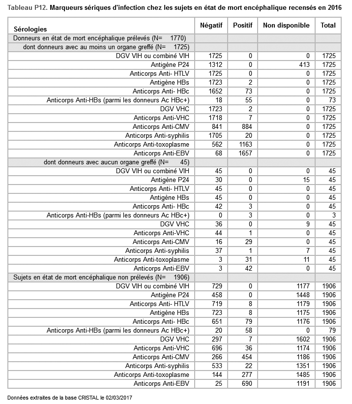 Tableau P12. Marqueurs sériques d'infection chez les sujets en état de mort encéphalique recensés en 2016