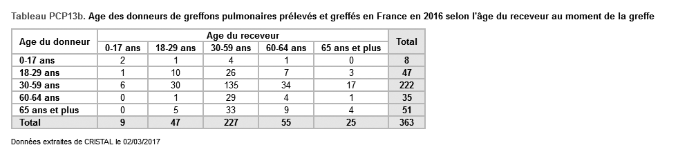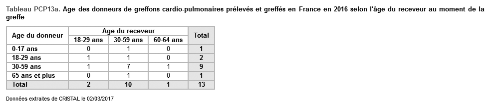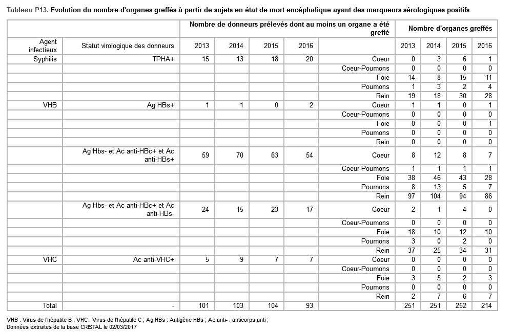 Tableau P13. Evolution du nombre d'organes greffés à partir de sujets en état de mort encéphalique ayant des marqueurs sérologiques positifs