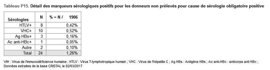 Tableau P15. Détail des marqueurs sérologiques positifs pour les donneurs non prélevés pour cause de sérologie obligatoire positive