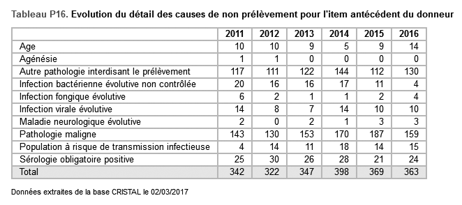 Tableau P16. Evolution du détail des causes de non prélèvement pour l'item antécédent du donneur