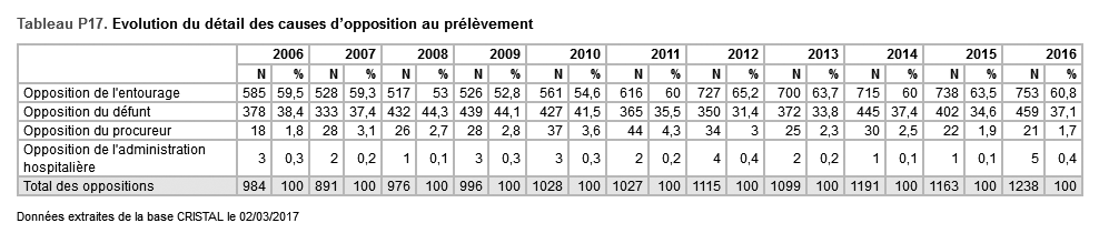 Tableau P17. Evolution du détail des causes d’opposition au prélèvement