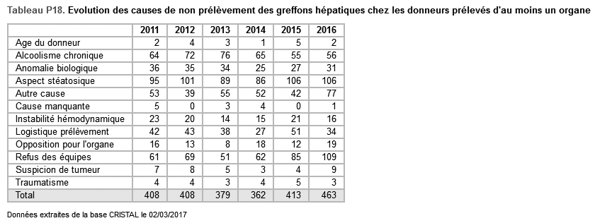 Tableau P18. Evolution des causes de non prélèvement des greffons hépatiques chez les donneurs prélevés d'au moins un organe