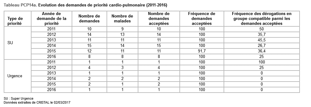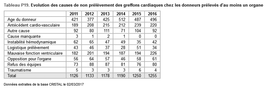 Tableau P19. Evolution des causes de non prélèvement des greffons cardiaques chez les donneurs prélevés d'au moins un organe