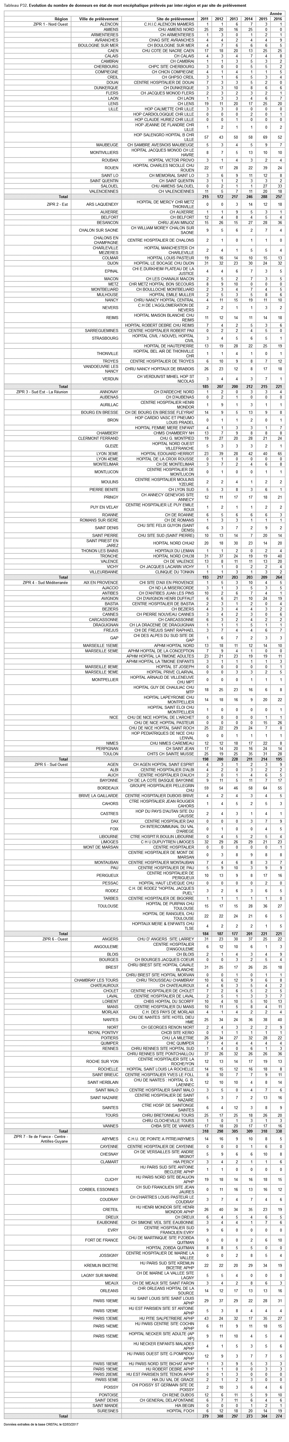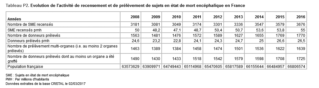 Tableau P2. Evolution de l'activité de recensement et de prélèvement de sujets en état de mort encéphalique en France