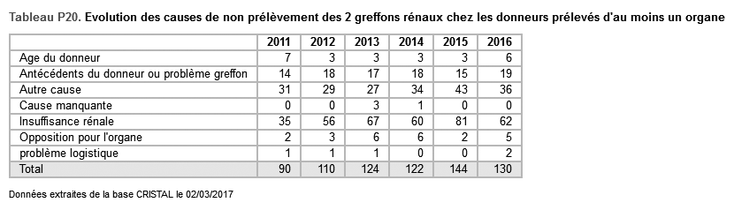 Tableau P20. Evolution des causes de non prélèvement des 2 greffons rénaux chez les donneurs prélevés d'au moins un organe