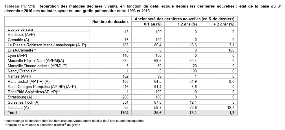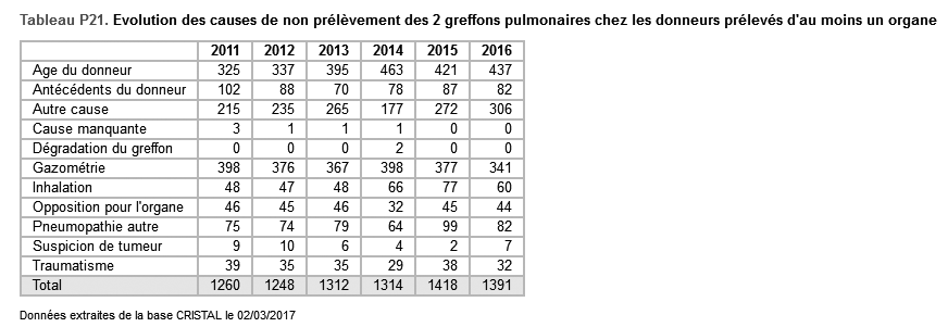 Tableau P21. Evolution des causes de non prélèvement des 2 greffons pulmonaires chez les donneurs prélevés d'au moins un organe