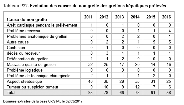 Tableau P22. Evolution des causes de non greffe des greffons hépatiques prélevés