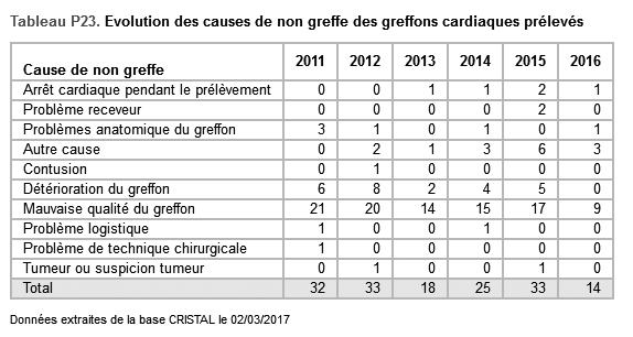 Tableau P23. Evolution des causes de non greffe des greffons cardiaques prélevés