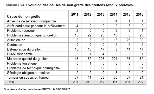 Tableau P24. Evolution des causes de non greffe des greffons rénaux prélevés