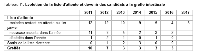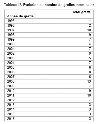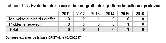 Tableau P27. Evolution des causes de non greffe des greffons intestinaux prélevés