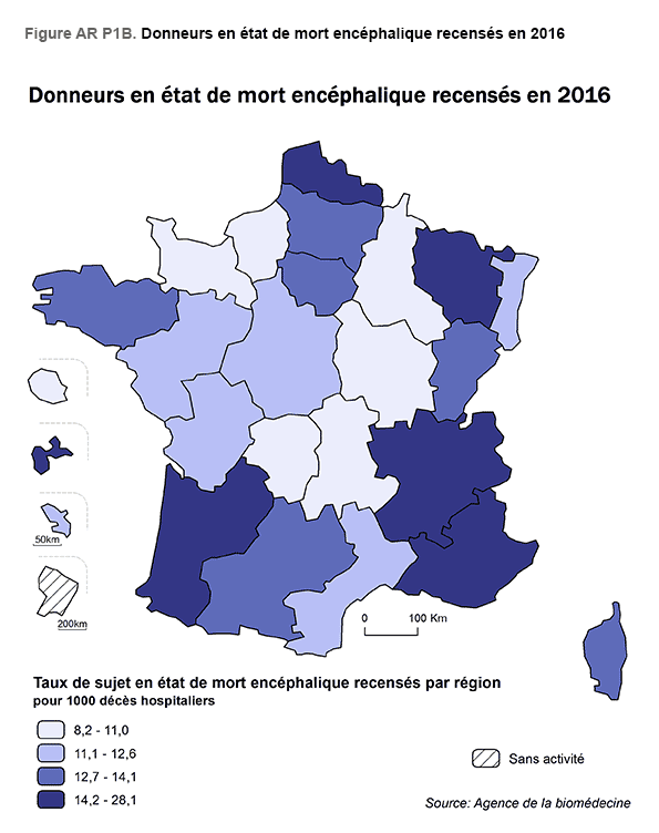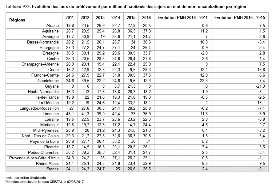 Tableau P29. Evolution des taux de prélèvement par million d’habitants des sujets en état de mort encéphalique par région