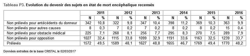 Tableau P3. Evolution du devenir des sujets en état de mort encéphalique recensés