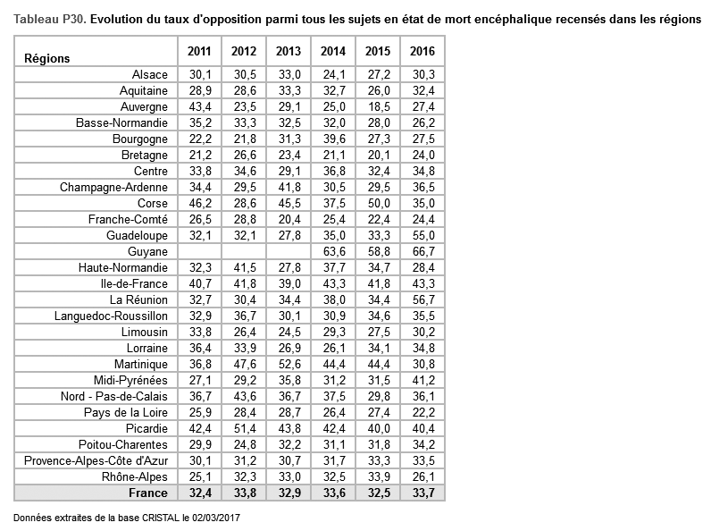 Tableau P30. Evolution du taux d'opposition parmi tous les sujets en état de mort encéphalique recensés dans les régions