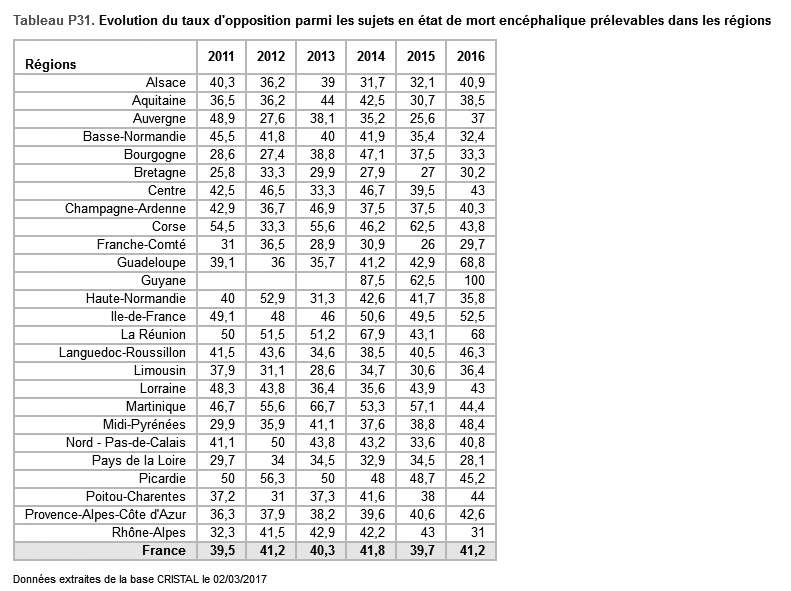 Tableau P31. Evolution du taux d'opposition parmi les sujets en état de mort encéphalique prélevables dans les régions