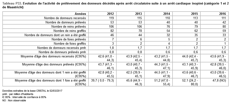 Tableau P33. Evolution de l'activité de prélèvement des donneurs décédés après arrêt circulatoire suite à un arrêt cardiaque inopiné (catégorie 1 et 2 de Maastricht)