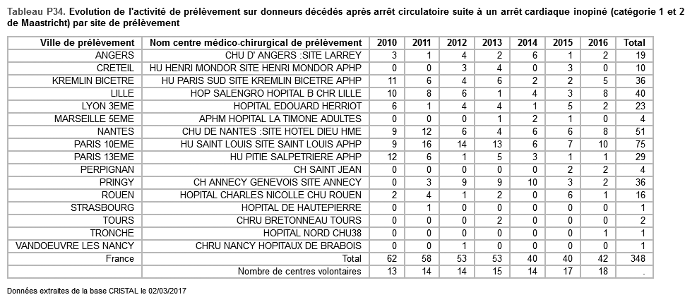 Tableau P34. Evolution de l'activité de prélèvement sur donneurs décédés après arrêt circulatoire suite à un arrêt cardiaque inopiné (catégorie 1 et 2 de Maastricht) par site de prélèvement