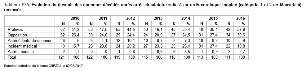 Tableau P35. Evolution du devenir des donneurs décédés après arrêt circulatoire suite à un arrêt cardiaque inopiné (catégorie 1 et 2 de Maastricht) recensés