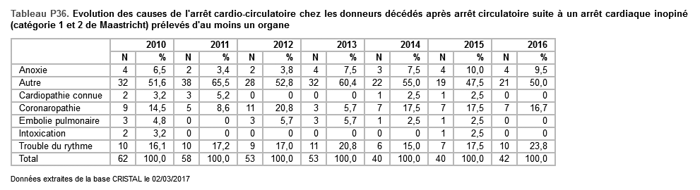 Tableau P36. Evolution des causes de l'arrêt cardio-circulatoire chez les donneurs décédés après arrêt circulatoire suite à un arrêt cardiaque inopiné (catégorie 1 et 2 de Maastricht) prélevés d'au moins un organe