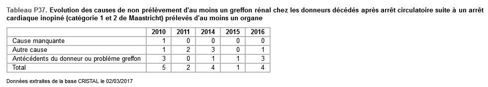 Tableau P37. Evolution des causes de non prélèvement d'au moins un greffon rénal chez les donneurs décédés après arrêt circulatoire suite à un arrêt cardiaque inopiné (catégorie 1 et 2 de Maastricht) prélevés d'au moins un organe