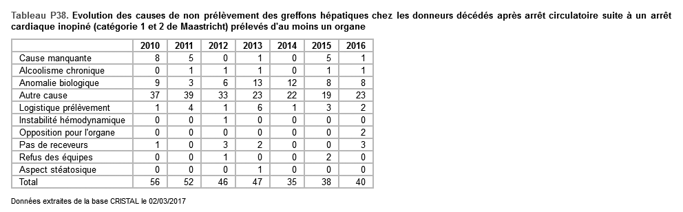 Tableau P38. Evolution des causes de non prélèvement des greffons hépatiques chez les donneurs décédés après arrêt circulatoire suite à un arrêt cardiaque inopiné (catégorie 1 et 2 de Maastricht) prélevés d'au moins un organe